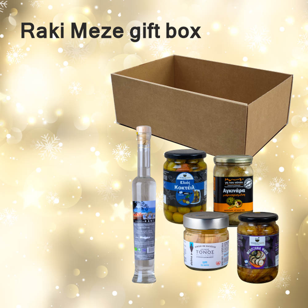 Raki Meze Gift Box από την TERRATASTE. Αυτό το καλάθι περιλαμβάνει μεγάλη ποικιλία προϊόντων όπως, Βιολογική Τσικουδιά Κρήτης Dalicate 200ml, Αγκινάρα Μαριναρισμένη 340γρ, Ελίες Κοκτέιλ 450γρ, Μελιτζάνα Ψητή 440γρ, Τόνος Λευκός Σε Νερό 212γρ.