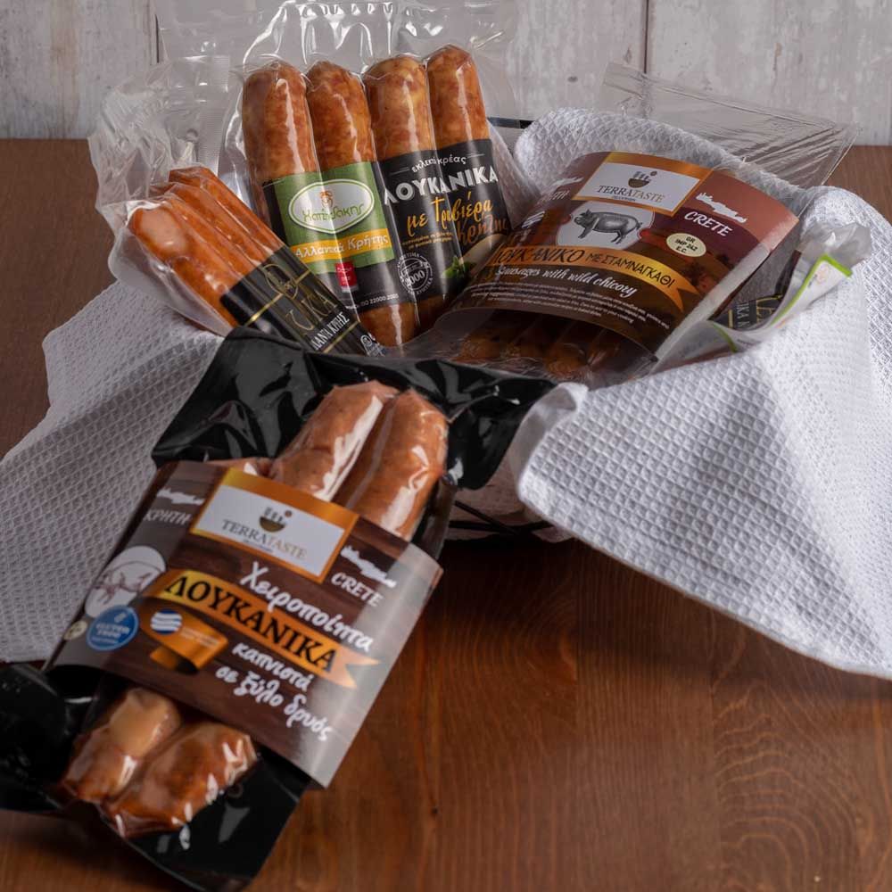 Κρητικά Λουκάνικα με γραβιέρα κρήτης, παρασκευάζεται από εκλεκτά κομμάτια κρητικού κρέατος καπνισμένα σε ξύλο οξιάς με φυσικά μπαχαρικά, και συνταγές από τις ρίζες της κρητικής μας παράδοσης. Ο συνδυασμός άπαχου κρέατος αρωματισμένο με Κρητικά καρυκεύματα δημιουργεί ένα προϊόν υψηλής διατροφικής αξίας και μοναδικής γεύσης.